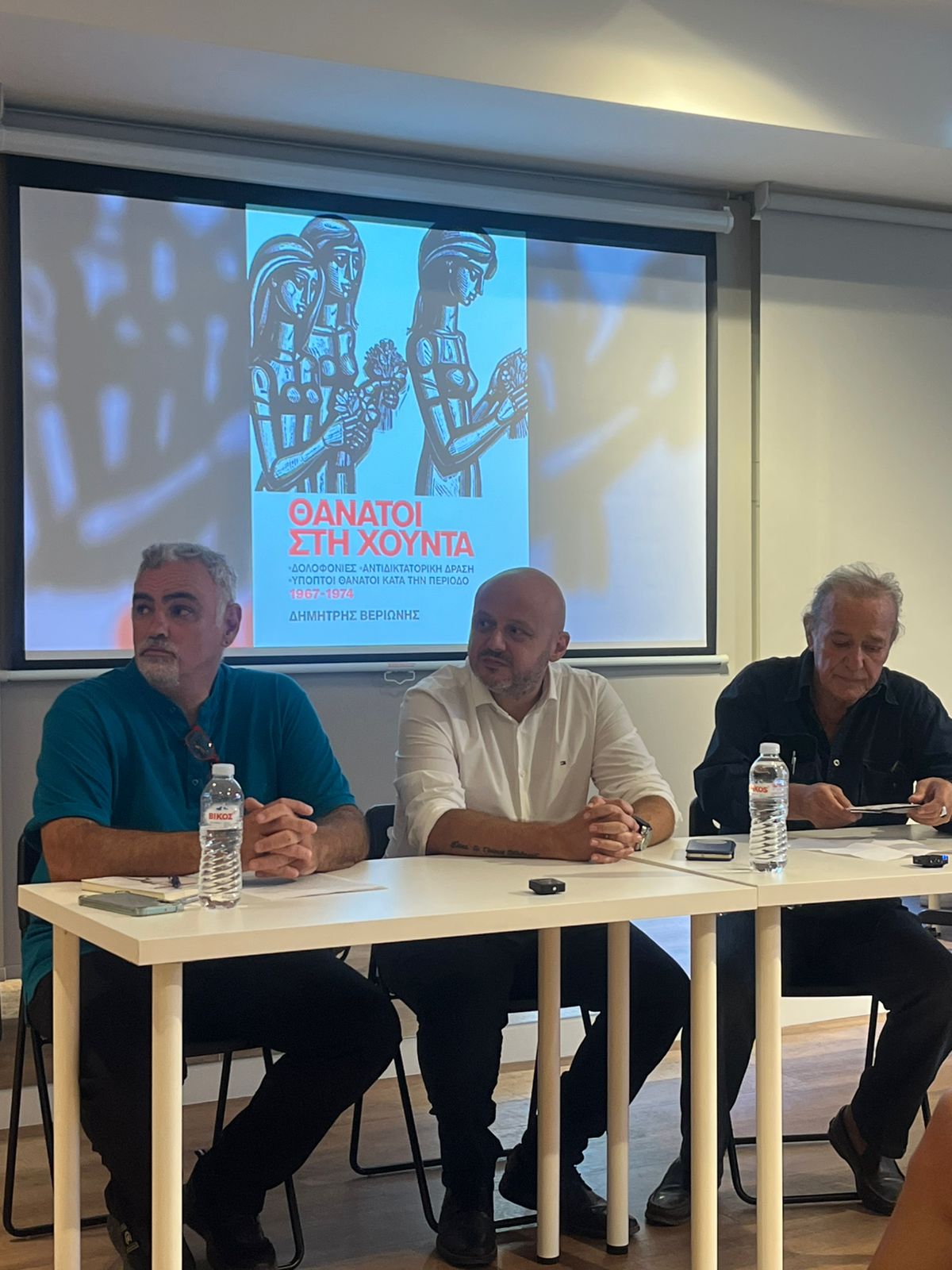 Μέσα σε μια πολύ ζεστή και συγκινητική ατμόσφαιρα πραγματοποιήθηκε την Τετάρτη 24 Σεπτεμβρίου 2025 στον φιλόξενο χώρο της Starttech Ventures μια συζήτηση επ’ αφορμή του βιβλίο του Δημήτρη Βεριώνη Θάνατοι στη Χούντα (εκδ. Τόπος), οργανωμένη από το ίδρυμα Βασιλείου Τσίγκου. Μεγάλη τιμή αποτέλεσε η παρουσία και η παρέμβαση του Δημήτρη Παπαχρήστου, ιστορικού εκφωνητή της εξέγερσης του Πολυτεχνείου ο οποίος αφού συνεχάρη το Ίδρυμα για την πρωτοβουλία πραγματοποίησης της εκδήλωσης, εστίασε στη σύνδεση του νοήματος των αγώνων της δεκαετίας του εβδομήντα για τη δημοκρατία με τη σημερινή δυστοπική κοινωνικοπολιτική κατάσταση.